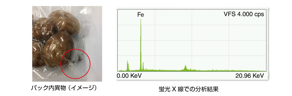 パックされた食品を開封せず異物の元素分析ができます。異物の元素が鉄(Fe)であることが判明し、金属がパック内に混入していることがかりました。