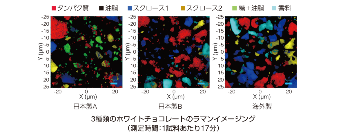 さらに、ラマン分光分析を用いた成分分布評価により、タンパク質、油脂、香料、異なる結晶構造を持つ2種類のスクロースが含まれていることがわかりました。日本製Aには主にココアバター由来と考えられる油脂が多く含まれており、日本製Bには牛乳由来と考えられるタンパク質が多く検出されました。また海外製には、日本製よりもスクロースと香料が多く含まれていることが分かりました。(測定装置: LabRAM Soleil)