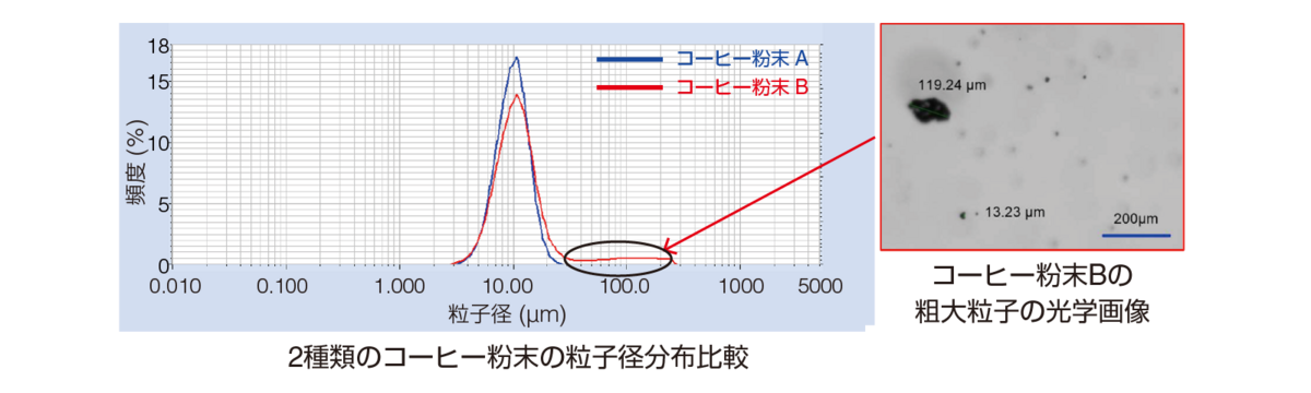 2つのコーヒー粉末の粒子径分布を比較し、コーヒー粉末Bには粗大粒子が存在することを確認できました。また、その粗大粒子は、画像解析ユニットを用いて凝集物であることを確認できました。