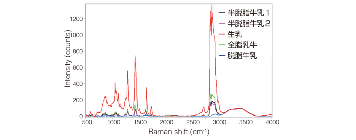 さらに、粒子径分布測定では区別できなかった異なるブランドの半脱脂牛乳を、ラマン分光分析を用いて化学的な情報を得ることで識別することができました。(発光ピーク強度 2875 cm-1の比較)(測定装置: XploRA PLUS)