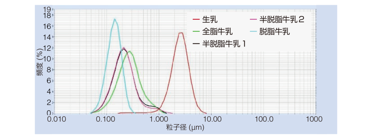 各種牛乳中の粒子径分布の測定結果から、生乳、全脂牛乳、半脱脂牛乳、脱脂牛乳の細分化・均質化の違いを見分けることができました。(測定装置: Partica LA-960V2)
