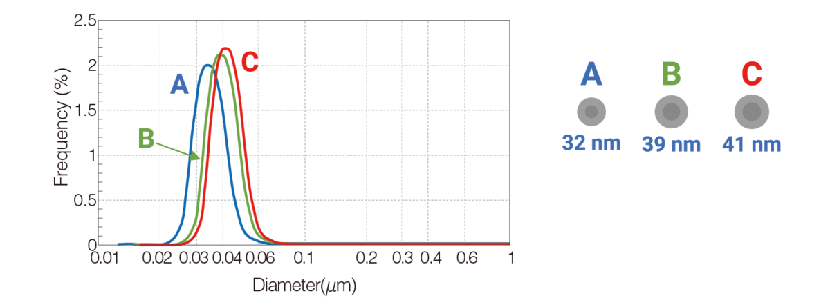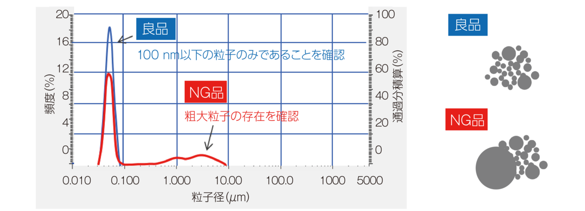 CMPスラリーの品質管理として、100 nm以下のOK品および数μm前後の粗大粒子(NG品)を迅速に判別できました。
