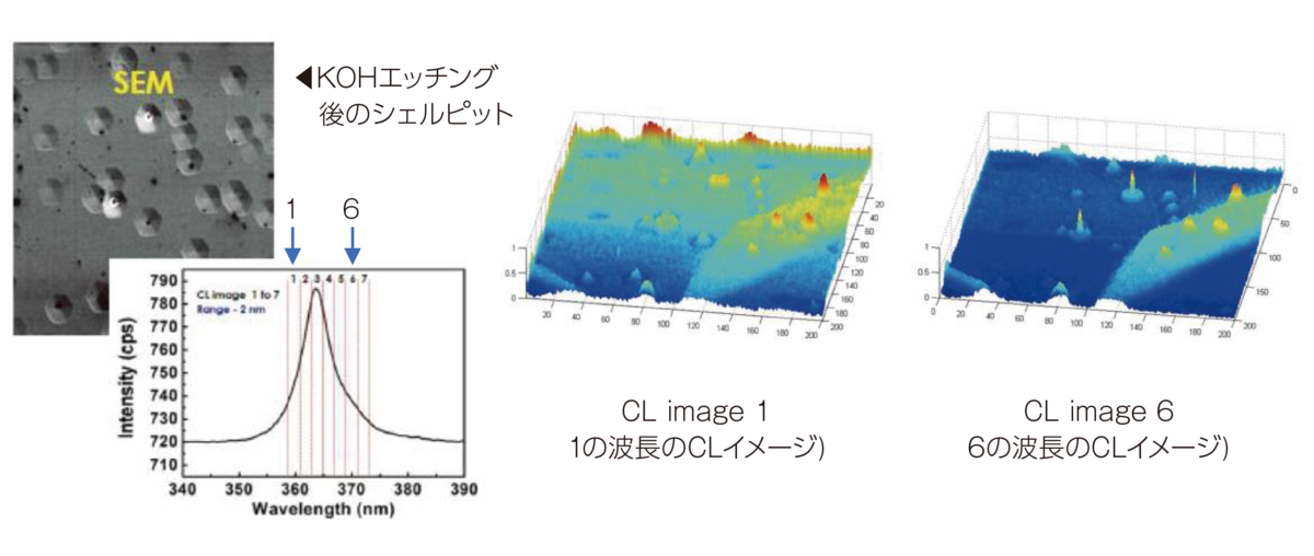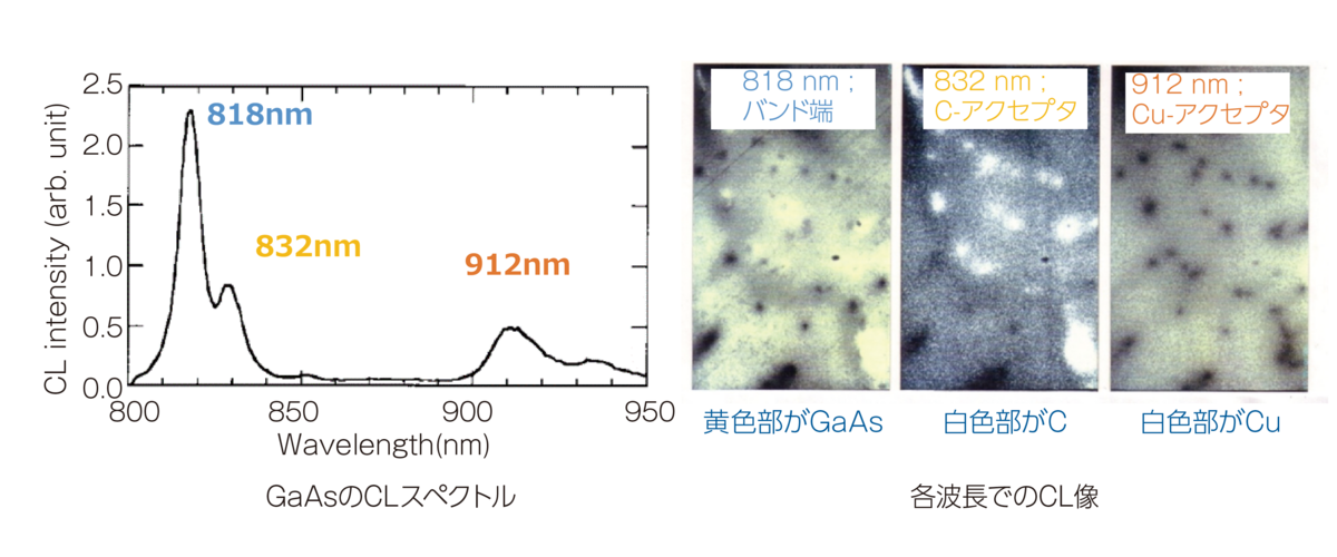 GaAsウェハをカソードルミネッセンス(CL)でスペクトル分析し、発光に寄与する準位ごとのピークを確認しました。 そのピークごとのCL像を取得した結果、カーボン、銅が点在していることを確認できました。