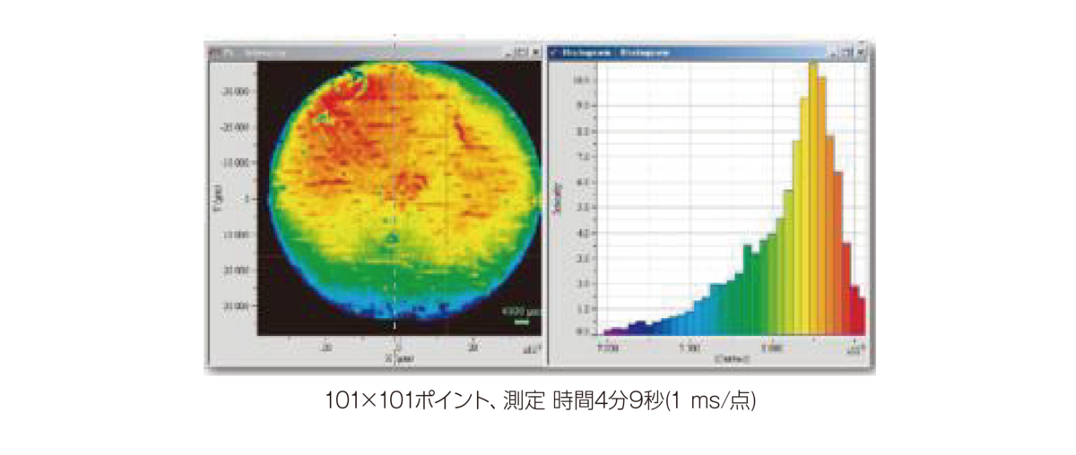 10000点以上のPL情報を数分で取得。ピーク波長分布をヒストグラムで表記。