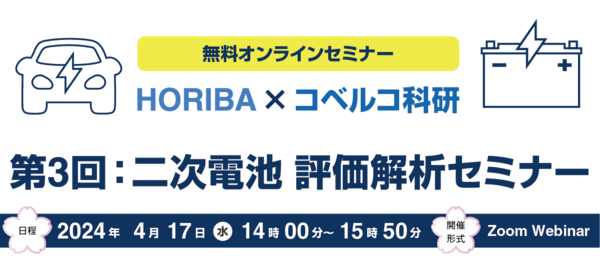 電気自動車(EV)、定置用蓄電池の普及拡大を背景に、企業や研究機関では様々な取り組みが進められており、二次電池に対する計測技術の高度化が求められています。今回は、二次電池に関連したHORIBAの分析計測技術と、コベルコ科研の電池試作・評価解析技術を紹介するセミナーとなっております。皆さまのご参加をお待ちしております。