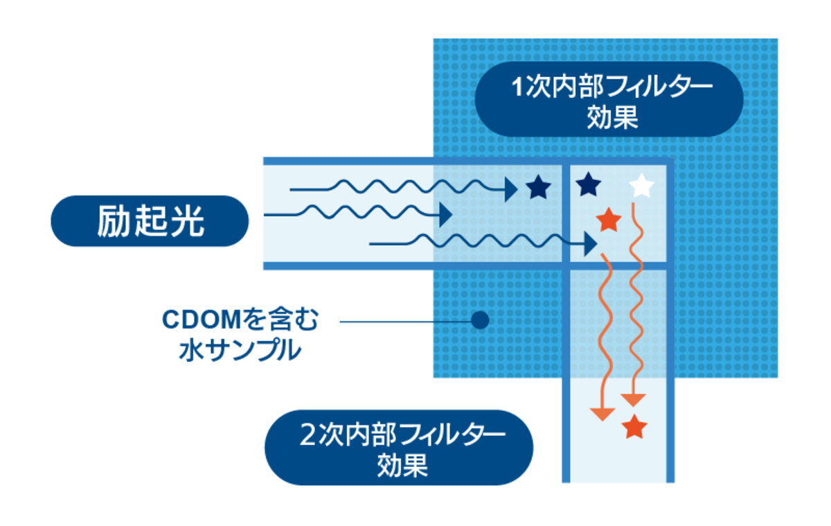 A-TEEMは、発色性溶存有機物の分析のために、高感度・高速分光技術として開発されました。蛍光性溶存有機物は、CDOM(Chromophoric Dissolved Organic Matter)と呼ばれ、アミノ酸、フミン酸、フルボ酸、およびその他の天然水源の腐敗物質、または水処理プロセスの消毒副産物が含まれます。 以前から、CDOM研究に一般的な蛍光分光光度計が使用されていましたが、これらの装置では測定時間が長く、また、吸光度の高い高濃度の試料の場合、励起光および発光が溶媒で吸収される現象である内部遮蔽効果によって、測定されるスペクトルが歪む現象により、正確な分析が困難であるといった問題がありました。