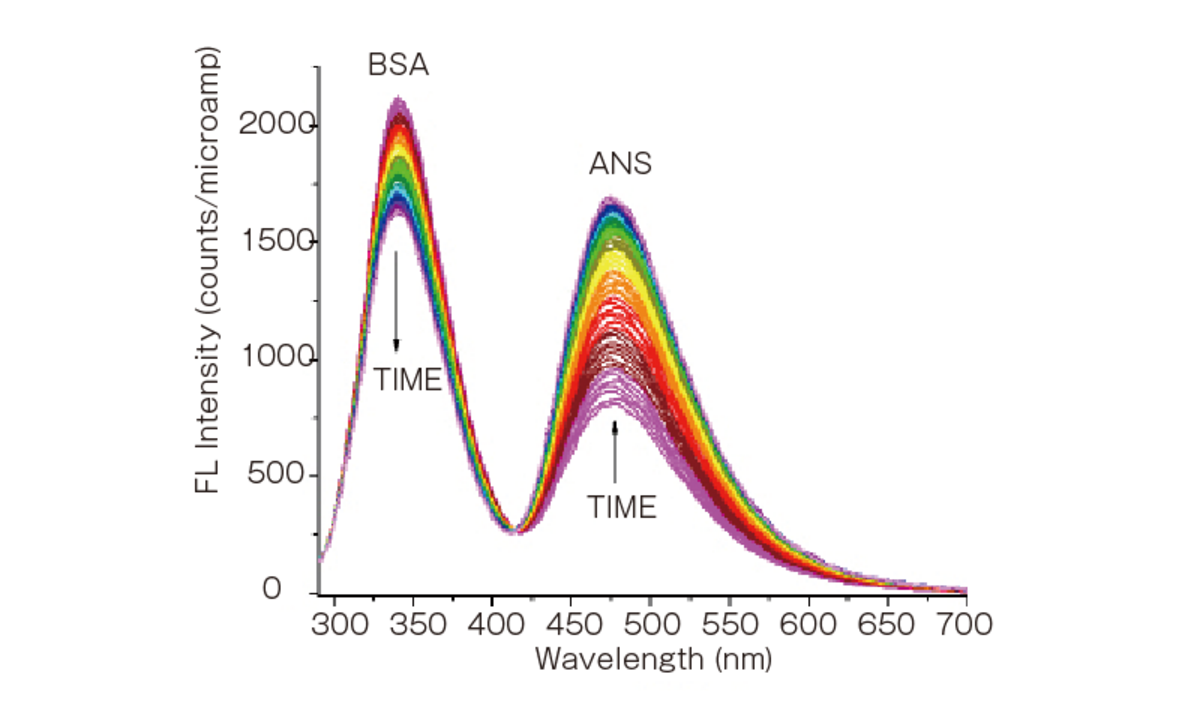 ANS(3×10-6M)を滴下後100ミリ秒ごとの発光スペクトルを測定