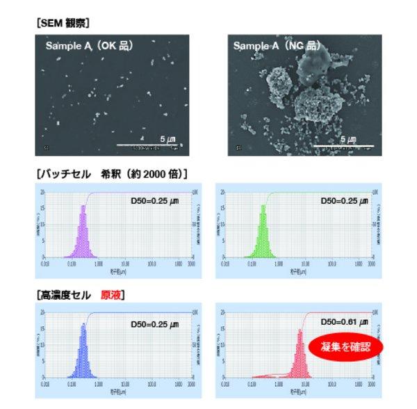 レーザ回折/散乱式の粒子径分布測定装置 Partica LA-960V2 高濃度測定用セルは、原液(希釈なし)または原液に近い状態で測定できます。さまざまな試料濃度での測定も可能です。