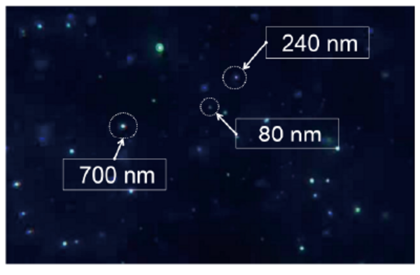 パーティクルトラッキング法では、画像を用いて一粒子ずつナノ粒子のカウントをするため、絶対値としての個数濃度が得られます。またブラウン運動の様子から粒子径を算出するので、特定の粒子径領域の濃度の値を得ることなども可能です。