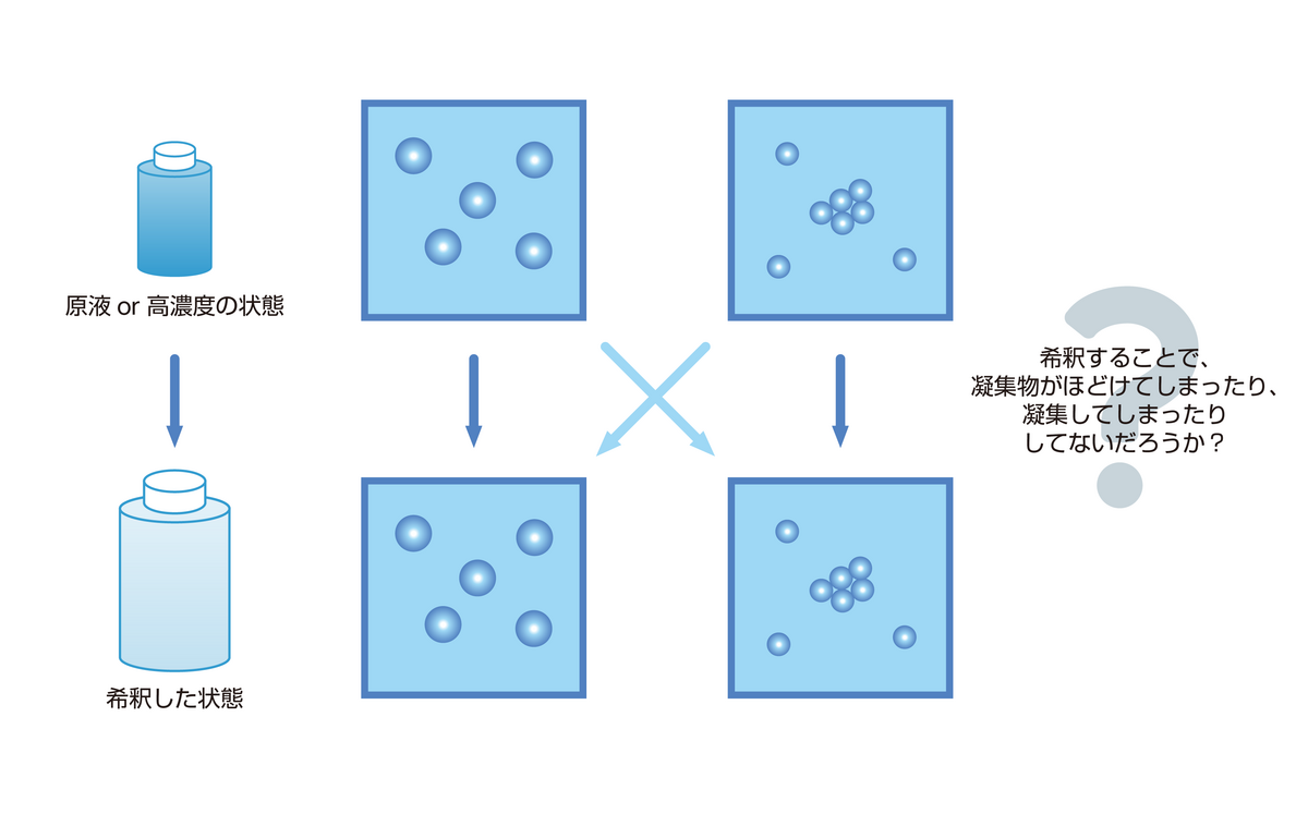 高濃度セルを用いて、希釈せずに原液の状態で測定することによって、初めて凝集状態を確認することができました。