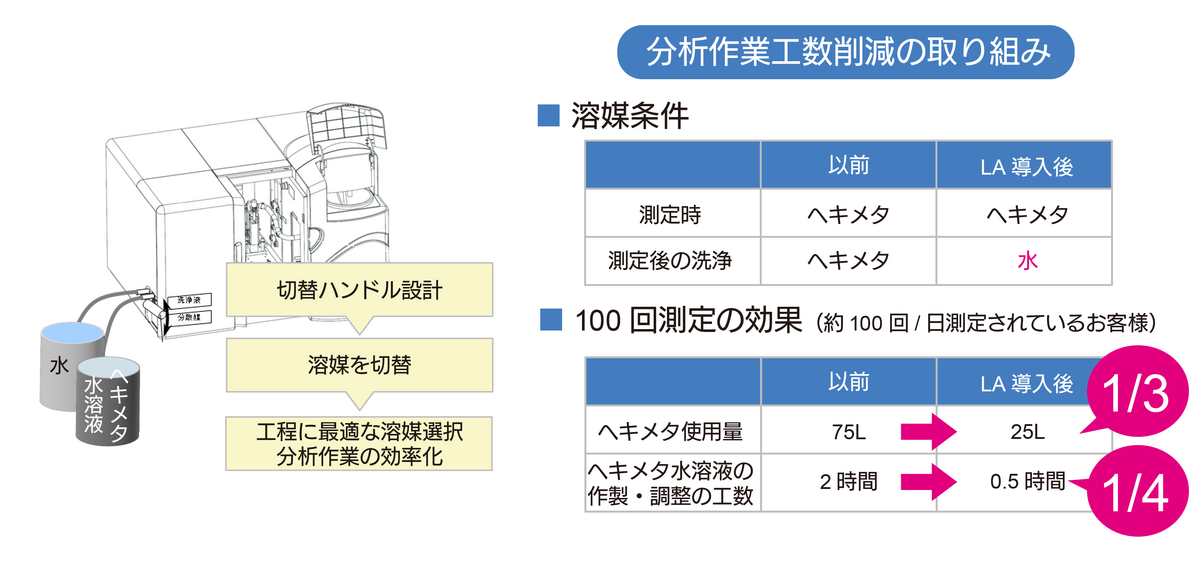 セラミックス分野では、微粒子を溶液中で均一に分散させるためにヘキサメタりん酸ナトリウム(以下、ヘキメタ)水溶液が使用されており、特に品質管理用途では測定検体数が多いため大量に消費されます。ヘキメタ粉末を純水に溶解させる操作は約30分間必要で、測定の事前準備に時間を要していました。測定時にはヘキメタ水溶液を、洗浄時には水に切り替えて粒子径計測することで、溶媒使用量と大幅な作業工数削減します。