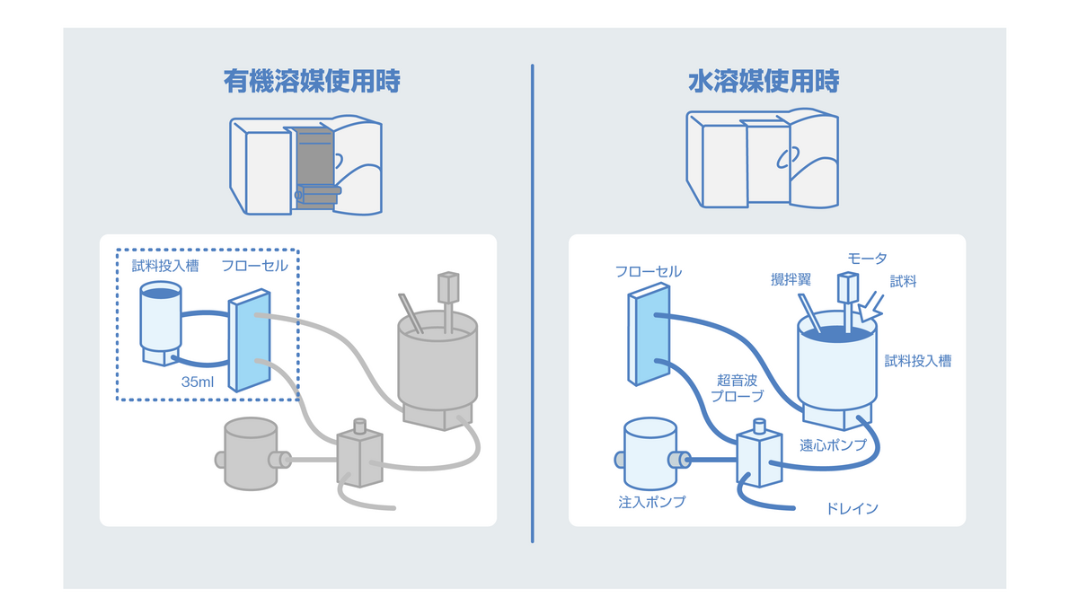 試料の分散媒量35 mLでのフロー式 測定が可能。分散媒に有機溶媒を用いる際にお薦めです。 超音波プローブや、分散媒の自動注入ポンプも標準装備しています。