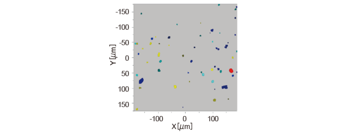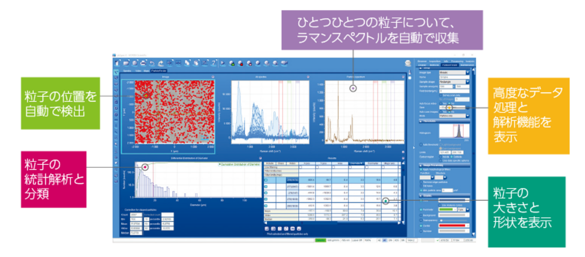 自動粒子解析ソフトウェア「PartcleFinder」は、数百~数千個の粒子の位置を光学イメージからすばやく検出し、粒子サイズ/形状とラマンスペクトルによる化学組成情報を関連づけて、自動で測定できます。 PartcleFinderを使うことで、一粒子ごとの成分分析や形状認識、粒径分析などの粒子解析が可能です。