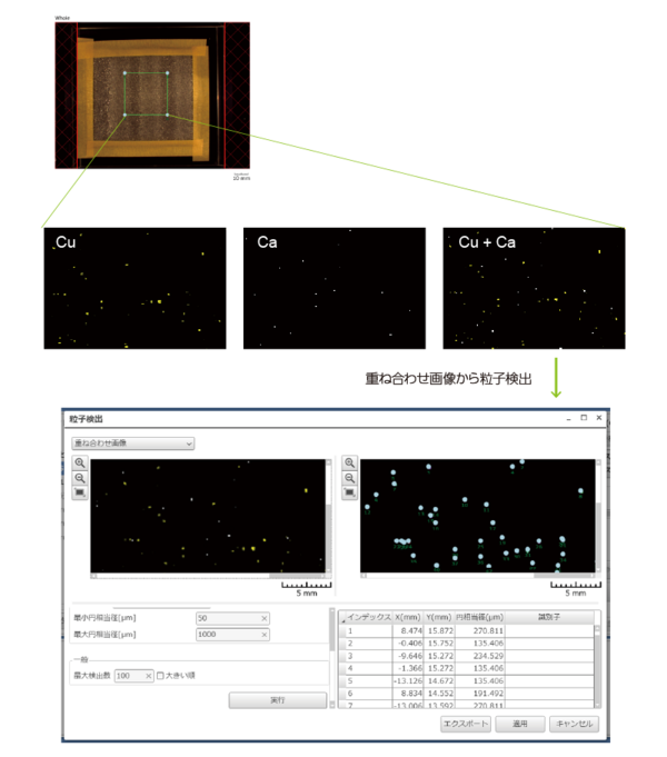 ラマン分光法では検出が難しい金属類の粒子解析には、微小部X線分析装置XGT-9000の粒子検出機能が便利です。 粒子を自動で検出し、多点測定も自動で行います。 光学像、元素マッピング像、透過X線像のいずれにおいても利用でき、容易に粒子の分類を行うことができます。