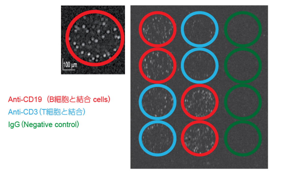 B細胞(10⁶ cells/ml)とT細胞(10⁴cells/ml)の混合サンプルの同時検出の結果で す。濃度に応じた細胞の検出がされています。 (In collaboration with CEA, France and INSERM, France)