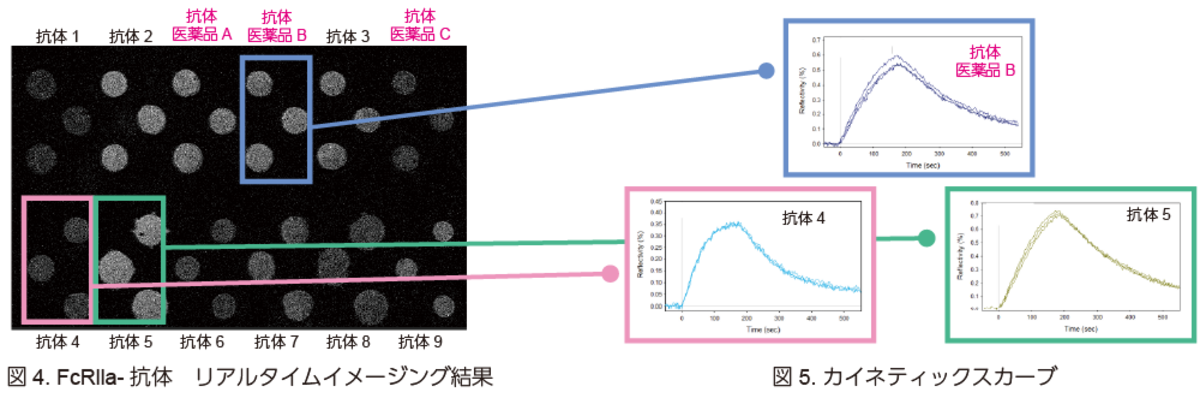 多数の抗体をリガンドとし、受容体タンパク質(FcRIIIa)をアナライトとして流すことで、相互作用を一度に解析できました。 リアルタイムイメージング(図4)により、結合の定性的な結果が迅速に得られるため、抗体医薬品の開発などにおける多検体のスクリーニング用途での活用が期待できます。 同時に、カイネティックスカーブ(図5)から反応速度論的パラメータを測定することで、結合の強さ、結合/ 解離速度、持続性といった相互作用の情報を定量的に比較することができました。
