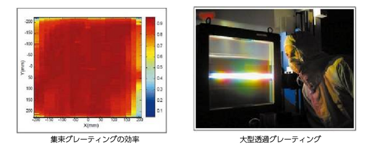 グレーティングは極めて高いエネルギーレベルで稼動することになるため、その効率を(この用途の場合、グレーティングは透過モードで使用され、効率は透過エネルギーと入射エネルギーの比率によって表される)限りなく1に近くしなければなりません。そうすることによって、システムのエネルギー移動の総量を最大限に保ち、消耗に伴うグレーティングの損傷を防ぎます。
