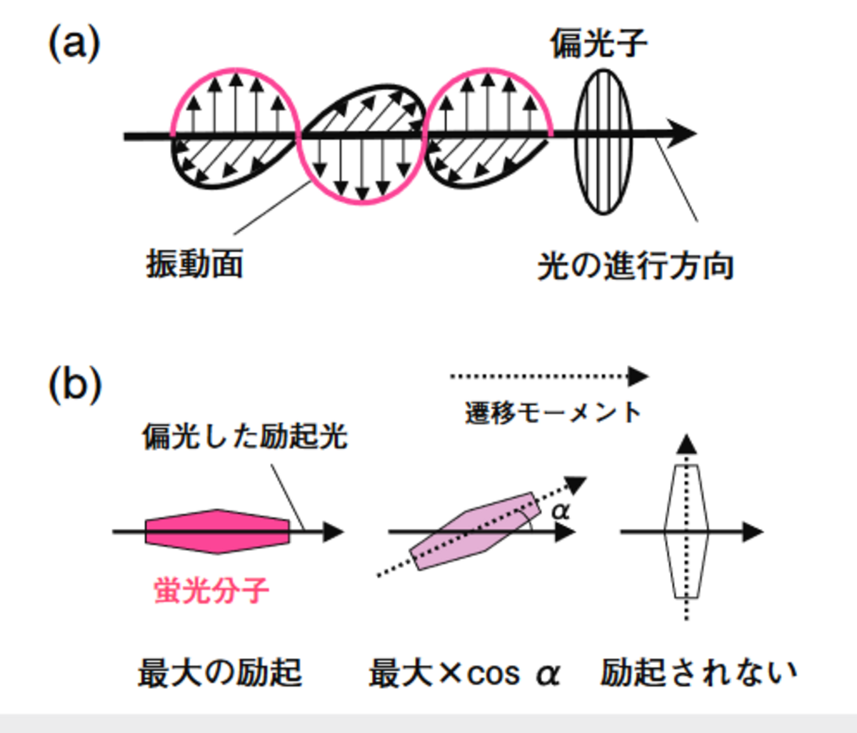 図2 偏光と光選択 (a)光は横波で,進行方向と垂直な面で振動 偏光子を通せば特定の振動面にある光だけを得ることができる(ここでは赤で示す)。 (b)光選択の原理 入射光の振動方向が,分子の遷移モーメントと平行であれば励起効率は最大,直交していれば0である。