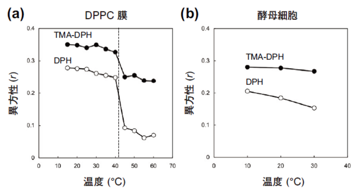 図4 DPPCと酵母細胞膜におけるDPHとTMA-DPHの異方性測定 (a) DPPC膜にDPHとTMA-DPHを取り込ませ,定常光励起により異方性r値の温度依存性を調べた。点線(42℃)より低温側がゲル相,高温側が液晶相である (b) 酵母細胞膜にDPHとTMA-DPHを取り込ませ,定常光励起により異方性r値の温度依存性を調べた。生体膜では相転移が見られないのがわかる