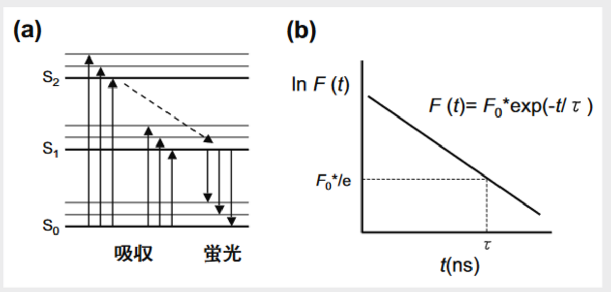 図1(a)に示すように,蛍光分子が基底状態にある時,電子はS0と呼ばれるエネルギー状態にある。蛍光分子が光エネルギーを吸収すると,わずかフェムト秒のオーダで励起状態に遷移し,過剰なエネルギーを散逸して第1励起状態S1の最低次の振動レベルまで落ちる。この状態は励起過程で最も安定であり,滞在時間は数十から数ナノ秒が普通である。ここから基底状態に戻る過程で蛍光が発する。蛍光強度の時間変化F(t)は式(1)で与えられる(図1(b))。