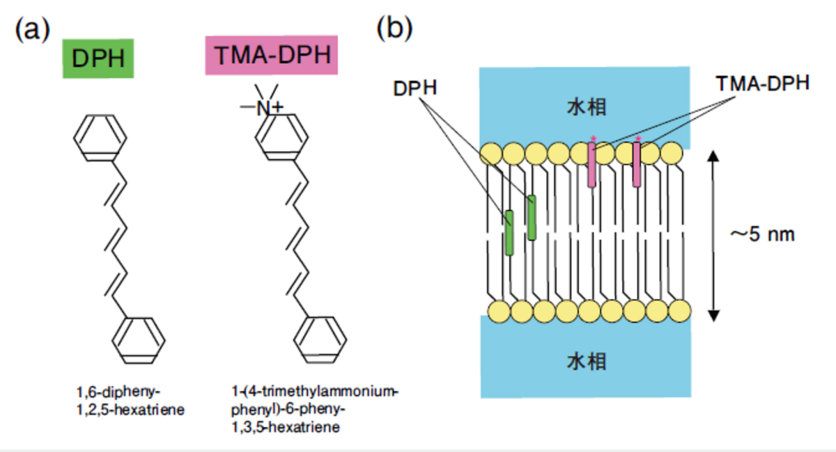 図3 DPHとTMA-DPAの分子構造と脂質二重層への局在 (a)DPHとTMA-DPAの分子構造 (b) DPHは脂質二重層の中央付近に,TMA-DPAは表面近くに局在する