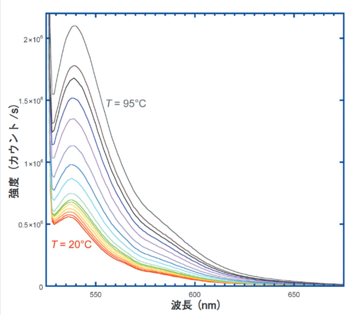 図2 サンプル温度を20~95 °Cの範囲で変化させた場合のTET(蛍光基)およびQSY(消光基)を備えたssDNAの発光スペクトル(λexc = 521 nm)サンプル温度が上昇するにつれて蛍光基と消光基との距離の増大し蛍光強度が増加する。
