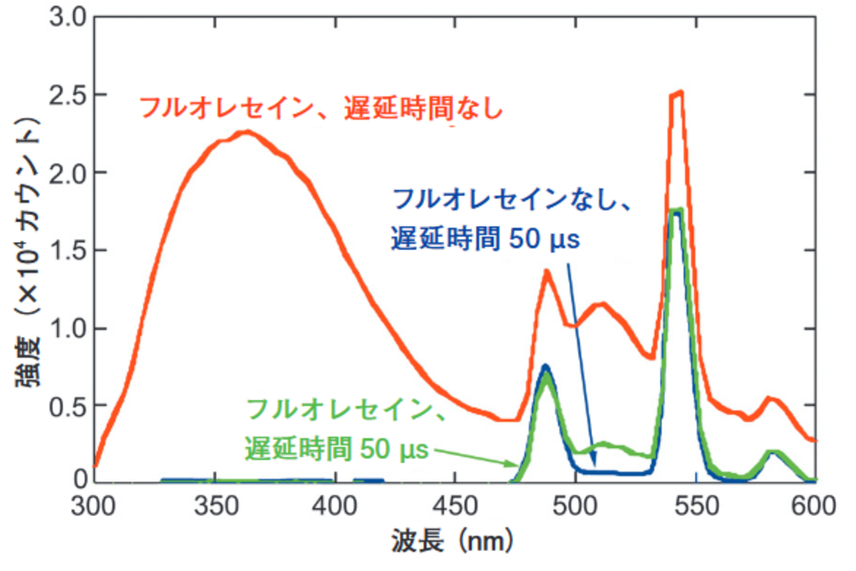 燐光種はテルビウム(Tb)であることが実験から確認された。ペプチド・テルビウム複合体にフルオレセイン0.67 μMを加えた場合と加えない場合,キセノンフラッシュランプによるパルス励起の間に50 μsの遅延時間のある場合とない場合について,3つの発光種(ペプチド,テルビウム(Tb),フルオレセイン)に対するプロットを図3に示した。363 nm付近の偽発光は,検出ウインドに50 μsの遅延時間を与えることで除去する。図3において,赤色の曲線で示すように遅延時間をかけない状態では蛍光と燐光が混じった状態で発光スペクトルが測定される。青色と緑色の曲線からフルオレセインの有無に関する違いが容易に比較され,511 nmにおけるフルオレセインの燐光発光は複合体からフルオレセインへのエネルギー移動によって起こることが示される。