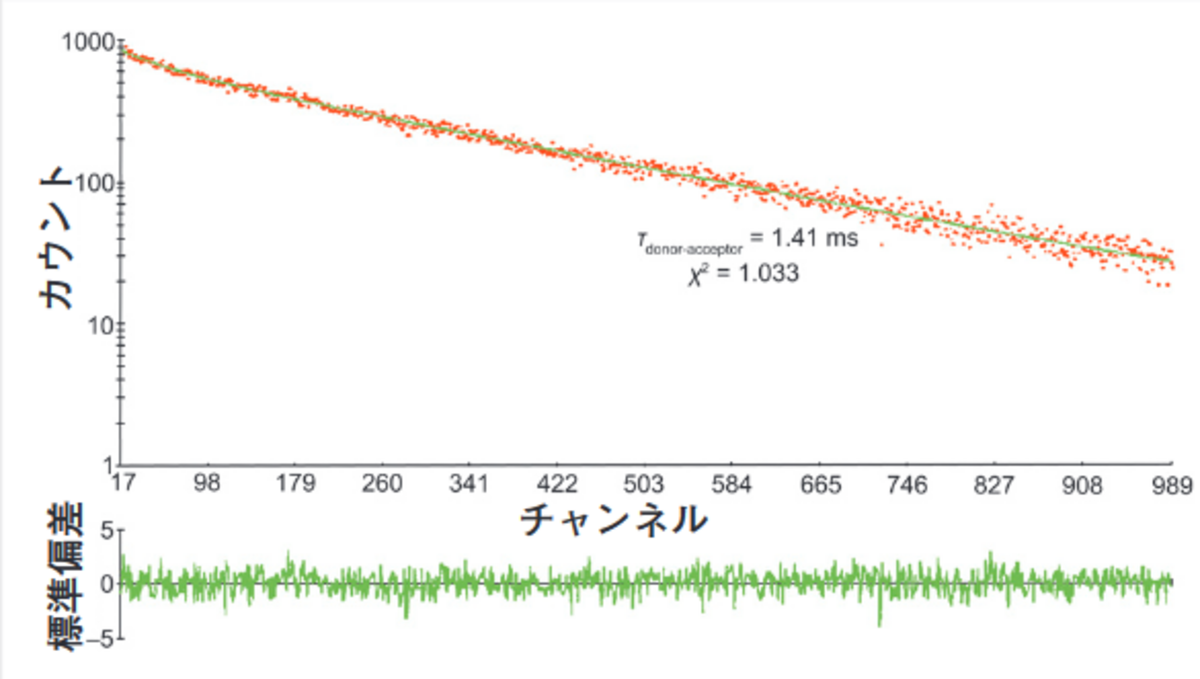 図4 テルビウム-フルオレセイン複合体の発光減衰曲線 解析フィッティングにより求めた発光寿命τ = 1.41 ms(χ² = 1.033)