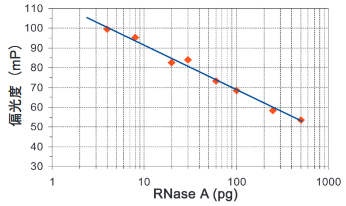 図6 25 ngフルオレセインで標識されたRNA に添加されたRNaseの量と偏光度との関係 完全に加水分解するため1時間以上経過した後にデータを測定した。RNase添加量の増加とともに異方性が低下することはRNAの断片化の進行を示している。