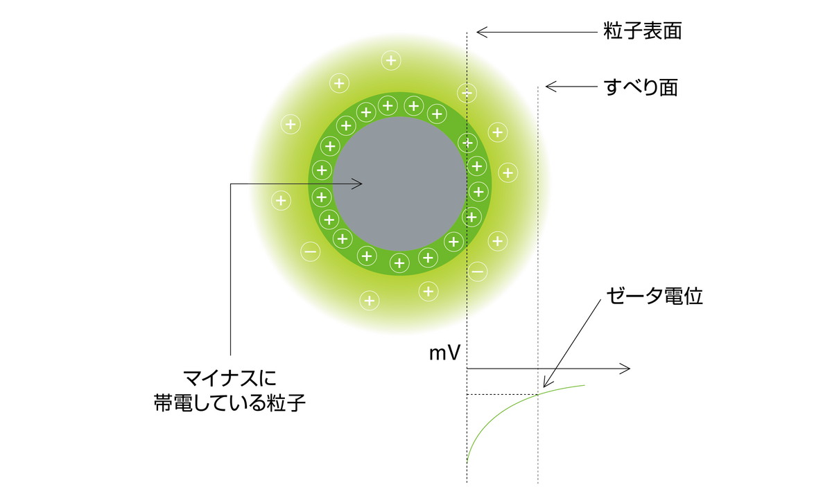 粒子表面の近傍では粒子表面の電荷と反対符号のイオンが多く存在します。 粒子分散液に電圧をかけると、粒子表面の電荷量に応じて粒子が並進運動します。この運動は電気泳動と呼ばれます。 この時、粒子と共に電気泳動するイオンの表面をすべり面と呼びます。 ゼータ電位とは、すべり面での電位と定義されており、粒子の分散性の指標として広く使われています。