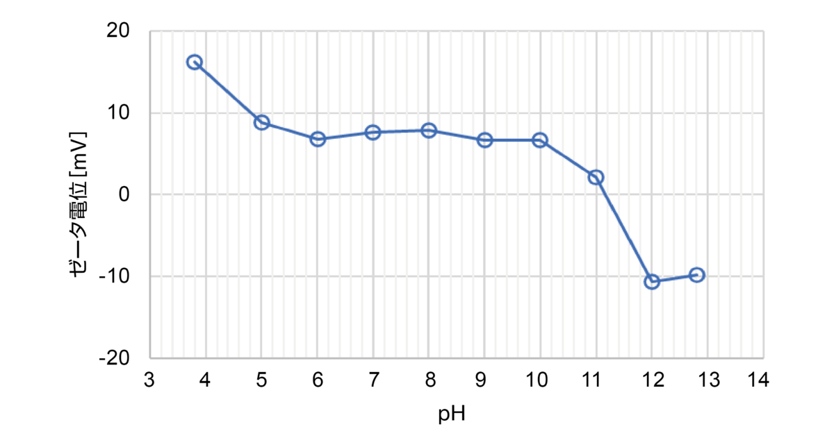 粒子のゼータ電位は溶媒のpHやイオン濃度にも依存します。ゼータ電位がゼロになるpHを等電点と言います。 等電点では粒子が最も凝集しやすくなるため、安定した粒子分散液を得るためには、等電点を回避したpHにする必要があります。 ここではpHを変えながらリゾチームのゼータ電位を測定した結果を示します。