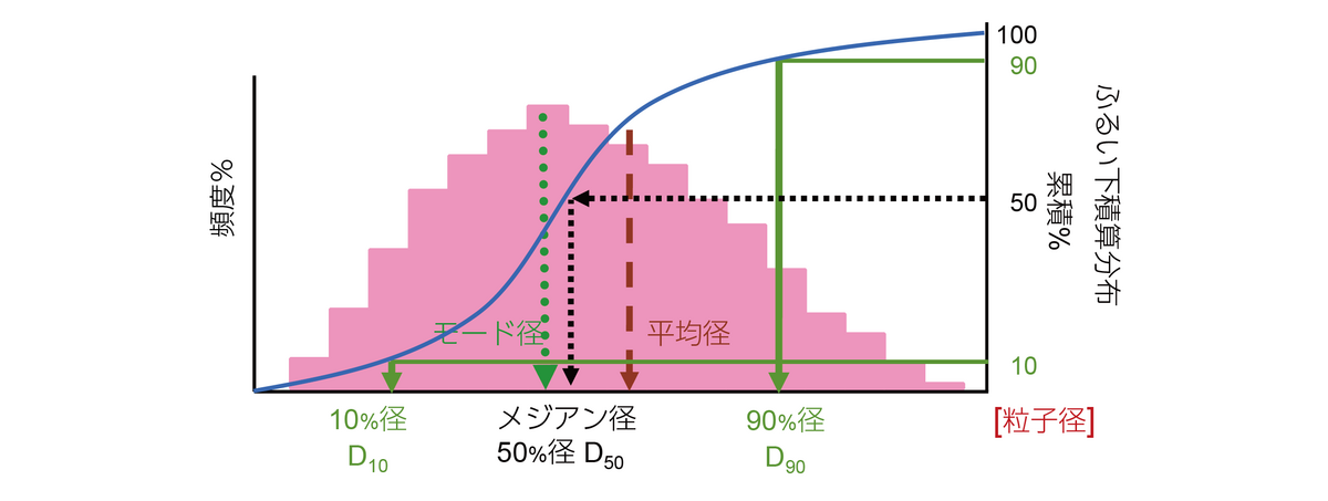 メディアン径(中央値)、平均径、モード径(最頻値)の関係