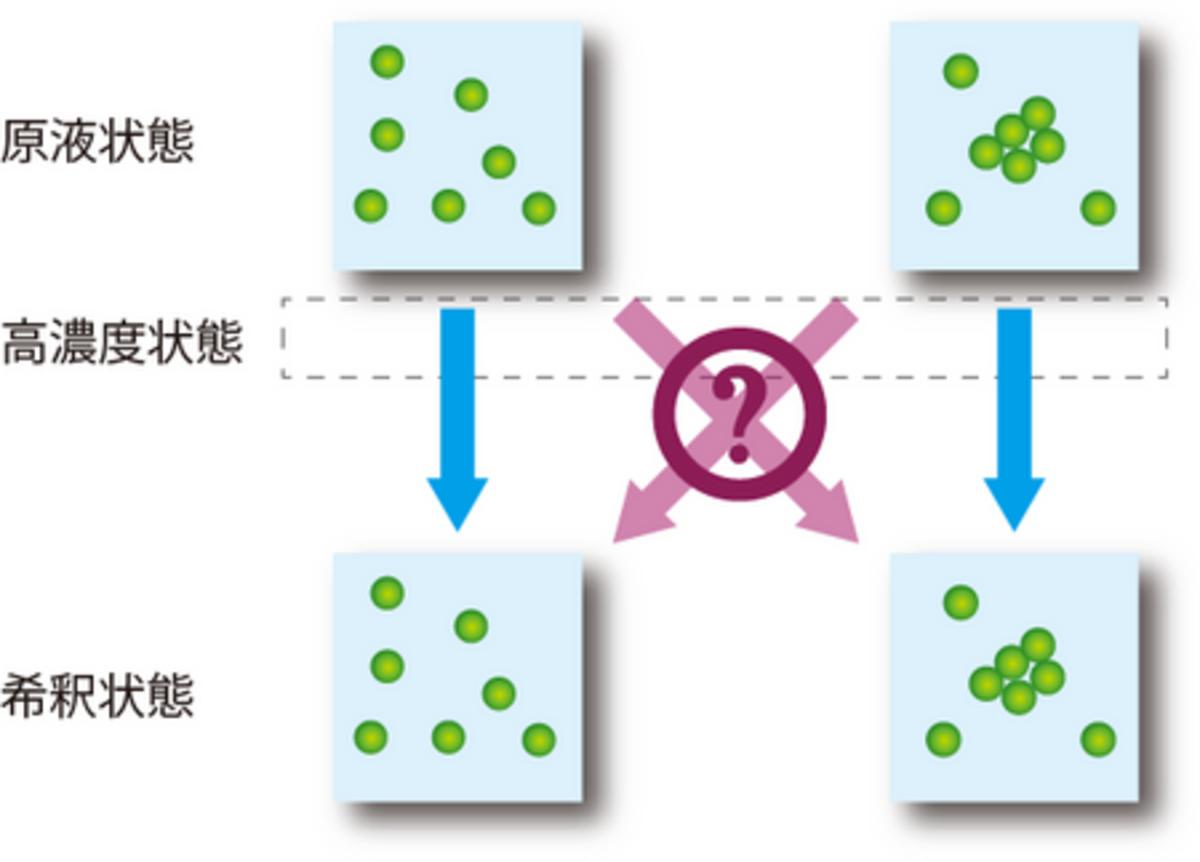 しかし実際には、原液状態では凝集物が存在していて、希釈したことにより凝集物が分散しただけかもしれません。