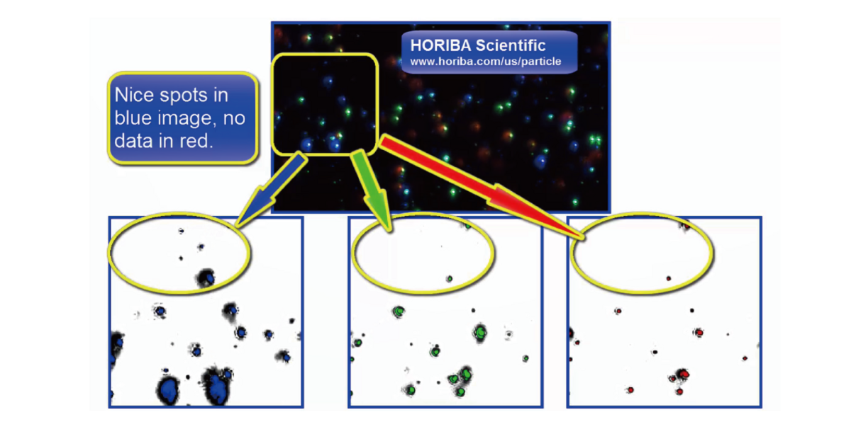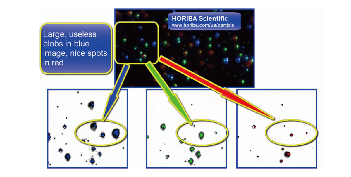 実際に、3 色に分けた画が下記です。 左図では、小さい粒子が存在している箇所ですが、青色では観察できている一方で、赤色では観察できていません。 青色の情報を用いることで、赤色だけでは取得できなかった小さい粒子の情報が得られています。右図では大きい粒子が存在している箇所ですが、赤色では点として観察できている一方で、青色では強度が強すぎて、粒子の存在している位置が特定できなくなります。