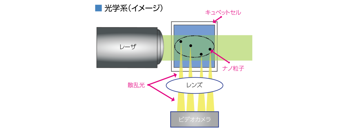 溶媒中の粒子にレーザー光を照射すると、粒子によって光が散乱されます。レーザー光の光軸に対し、直角の方向からカメラで観察すると、粒子が輝点として観察されます。測定対象となる粒子は、光学的な分解能よりも小さく、輝点の大きさからでは粒子径はわかりません。しかしながら、この輝点がブラウン運動によりランダムに動き回る様子を観察することができます。したがって動画を取得し、1 フレームごとに粒子がどこに移動したかの軌跡を追跡することで、ブラウン運動の変位(速度)を算出できます。