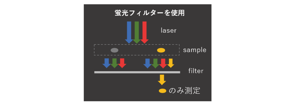 照射した光の波長以外の波長で光る粒子(蛍光粒子)を分析することも可能です。入射光の波長をカットするフィルターをカメラの前に設置することで、散乱のみを起こしている粒子は見えなくなり、蛍光を発している粒子のみを観察できます。これにより、特定の蛍光マーカーが付いた粒子のみの粒子径と個数濃度を分析することができます。例えばエクソソームなどのバイオマテリアルでは蛍光標識されたもののみを分析することで、夾雑物の情報に影響されない分析が可能です。