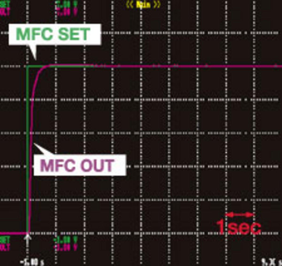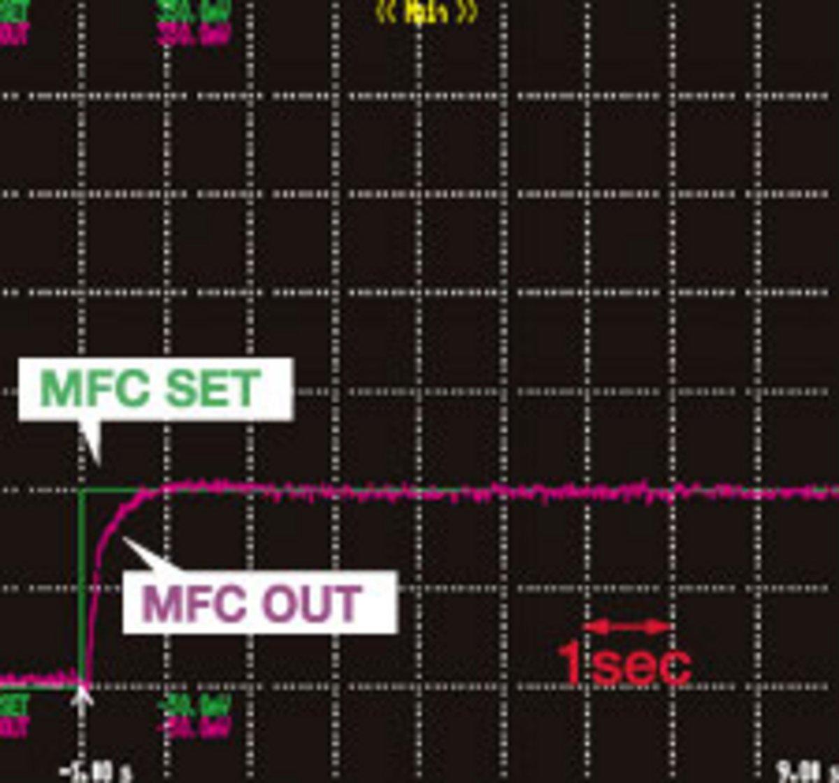 新開発のVariable PIDアルゴリズムを搭載し、全流量制御域において1秒以内の高速応答を実現しました。Variable PIDアルゴリズムとは、設定流量の変位に応じたPID係数を連続的に変化するものです。フルスケール流量・ガス種の変更後も高速応答を実現しています。