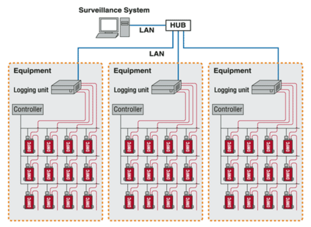 本マスフローコントローラ監視システムでは、半導体製造装置に搭載されているデジタルマスフローコントローラ(アナログ制御)の制御状態をデジタル通信により取り込み、予知保全に対する監視を行います。また本システムはLAN(TCP/IP)のネットワークに対応しており、半導体製造装置毎のマスフローコントローラの制御状態を上位に位置する1台のCMS PCにより監視する事が行えます。広範囲なエリアにおけるネットワーク構築も比較的容易に行えます。