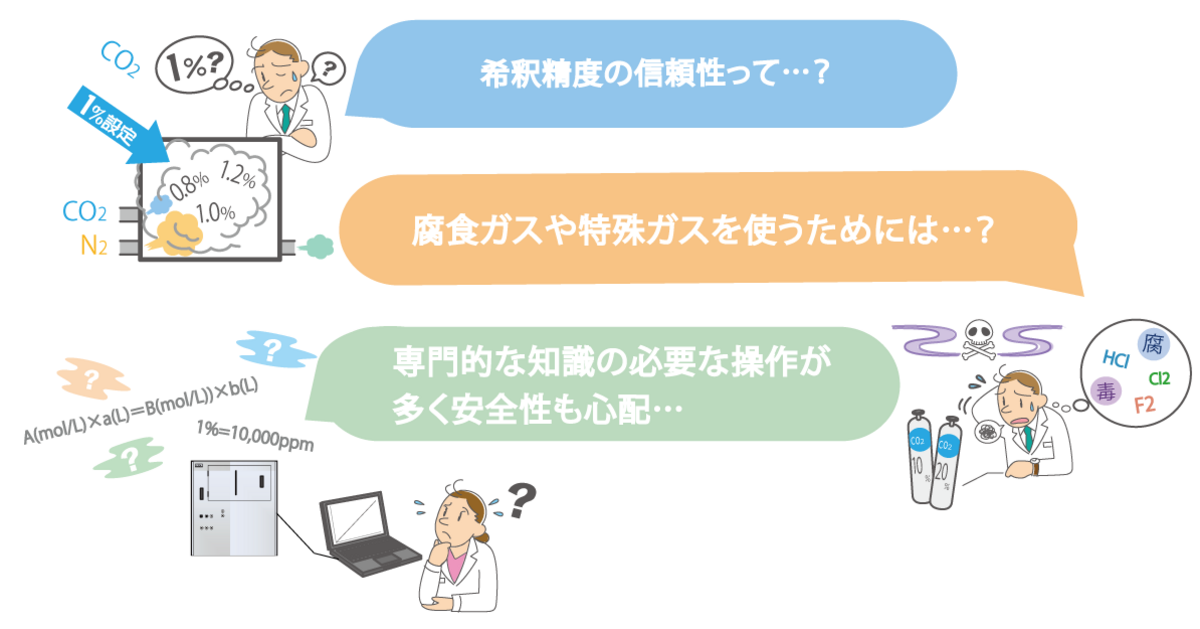 標準ガスの希釈には様々な課題があります。低濃度、腐食ガスの対応、専門性の高い操作・運用・安全対策、ガス置換、安定までの時間など。