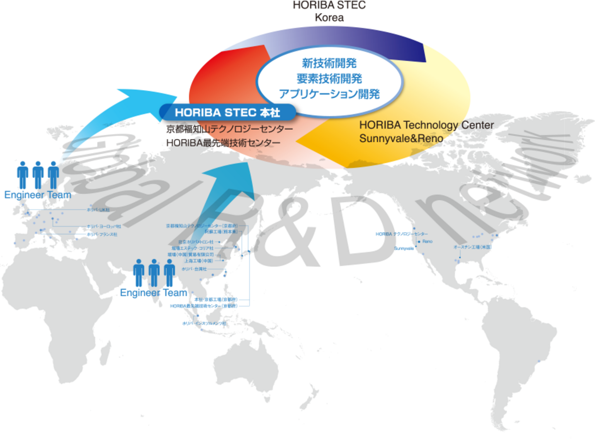 当社は流体計測・制御のエキスパートとして積極的なグローバル展開を加速しています。京都本社のオペレーションのもと国内においては、要素技術開発に特化した「京都福知山テクノロジーセンター」、本社併設の「HORIBA最先端技術センター」の連携はもとより、米国「HORIBA Technology Center」としてSunnyvale、Renoの2拠点が最先端の半導体プロセスに対応する新技術開発、要素技術開発に携わり、韓国「HORIBA STEC Korea」にはアプリケーションに対応したR&Dセンターを開設しています。