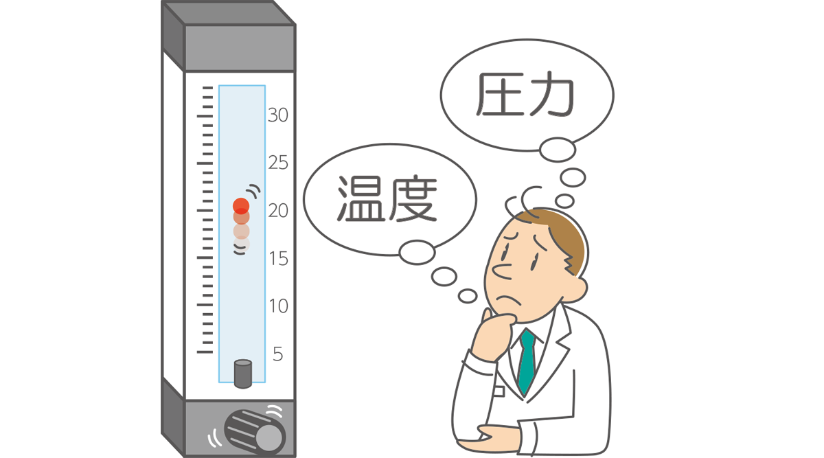 面積式流量計は基本的に体積流量を指示する方式であるため、気体の温度・圧力が変動する環境では、質量流量や濃度を安定して管理する用途には注意が必要です。