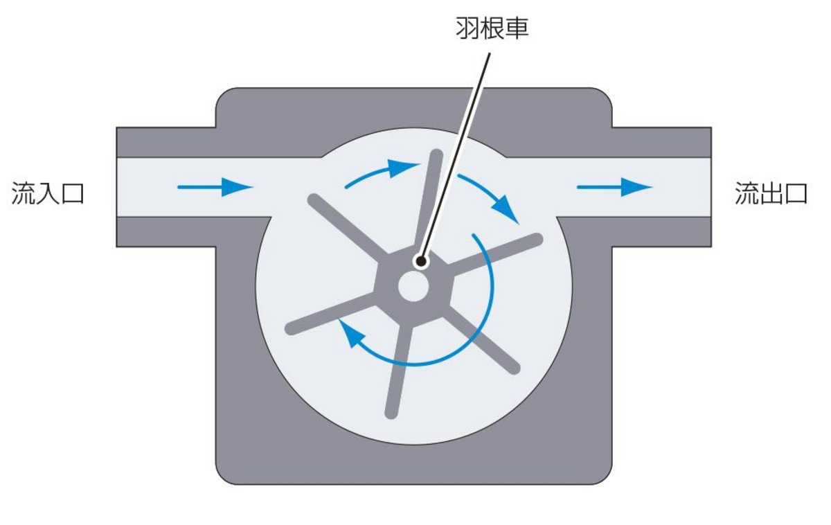 配管内を流れる液体が、流れと平行に取り付けられた羽根車に当たって回転し、その回転数を磁気センサやピックアップコイルで検出することで、瞬時流量や積算流量を算出します。