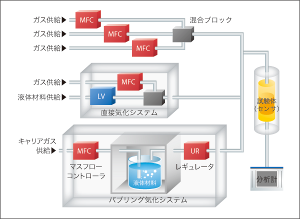 水分やアルコール等の添加には液体材料気化システムが用いられ、PPM濃度の水分添加により幅広いテストガスの発生が可能な総合的なシステムを提供しています。