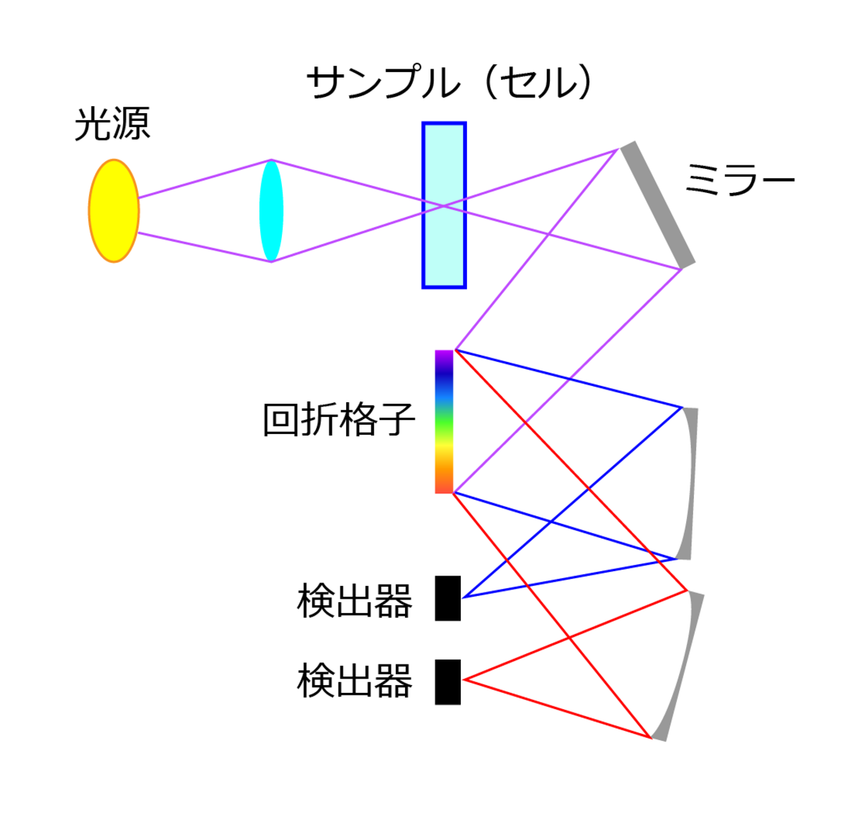 まず光源からの光を測定したいサンプルが入ったセルに照射します。サンプルを通過した光はミラーで反射され回折格子という光学部品に導かれます。回折格子は入射した光を紫外線や近赤外線などの波長ごとに分解し、別の角度に反射する特性を持っています。分解された各波長の光はそれぞれの検出器に入ることで、波長ごとにどれだけサンプルに吸収されたかを検知します。