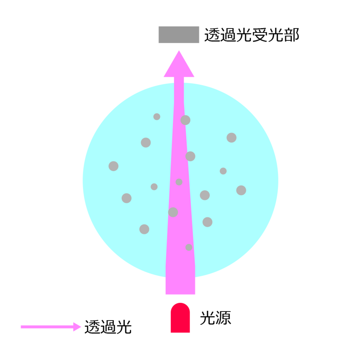 光透過法とは、サンプル中に、一方の光源から光を照射して、サンプルを通過することによって反対側の受光部に透過する光が減衰することを測定原理としています。