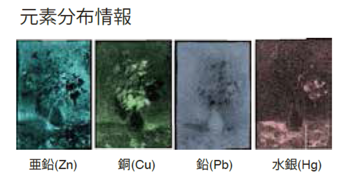 また、作品をスキャンして得られる元素像と透過X線像を組み合わせることで、絵の具の下に重ね描きされた絵の発見や、過去の修復履歴を確認することも可能です。このように、蛍光X線分析は非破壊・非接触の分析手法として文化財や美術品の調査に貢献しています。