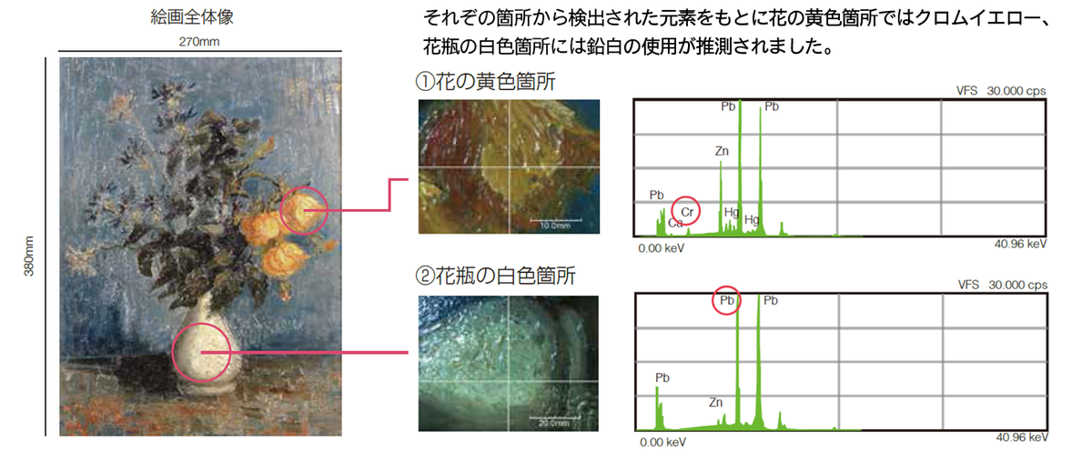 文化財・美術品に使用されている塗料に含まれる元素成分を分析することで、作品が制作された年代の推定や補修時に使用する絵の具などの塗料を再現する手がかりとなる情報を得ることができます。