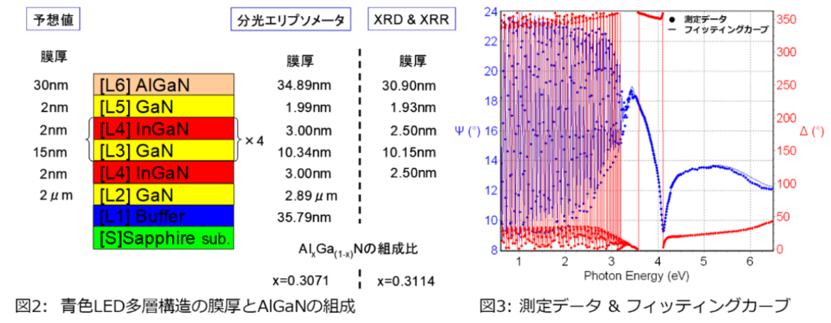測定したサンプルは、青色LEDに使われる多層構造です。これを分光エリプソメーターで測定し、 各層の膜厚とn&k、さらにAlGaNの組成比を求めました。さらにクロスチェックとして、X線回折 (XRD)と X 線反射率(XRR)による評価も行いました