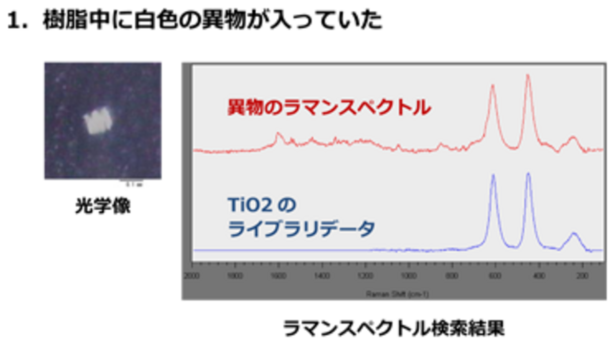 サンプリングすることなく、顕微ラマン分光装置で異物を同定。 塗料などに使われる酸化チタンであることが分かりました。