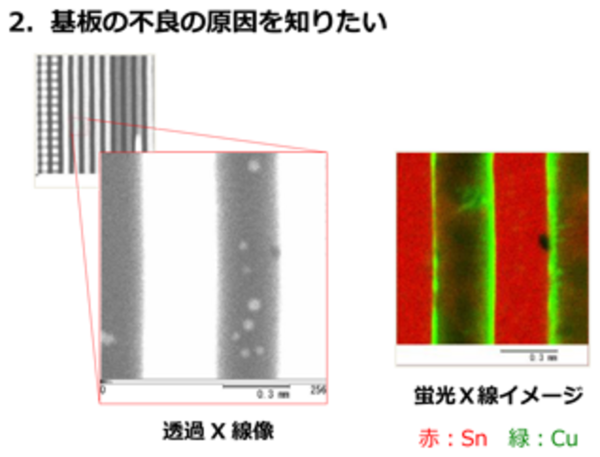 X線分析顕微鏡による透過X線像により、内部のボイドが見つかりました。 また、元素マッピングにより配線のCuがイオンマイグレーショを起こしている様子が確認できました。
